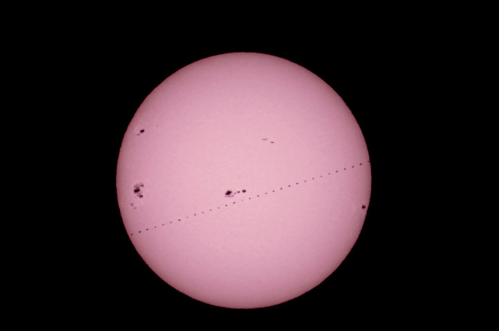 1月16日,在北京丰台花园拍摄的中国空间站飞过太阳的过程(堆栈合成照片)。
