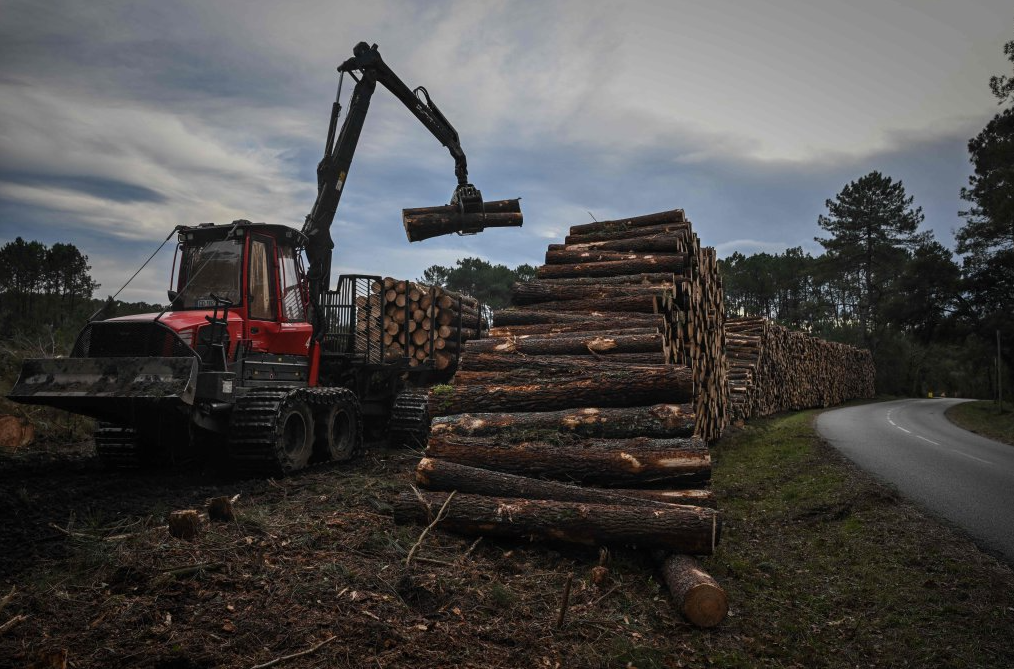 在法国塞尼奥斯附近,工人将砍下的松木堆在路边。