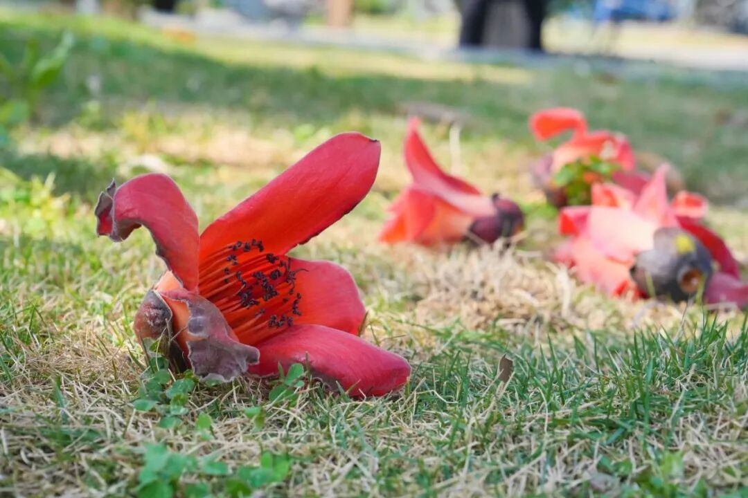 据了解,攀枝花在枝头盛开后不会马上枯萎,而是直接从树上脱落,一朵一朵躺在地上,仍艳红饱满。