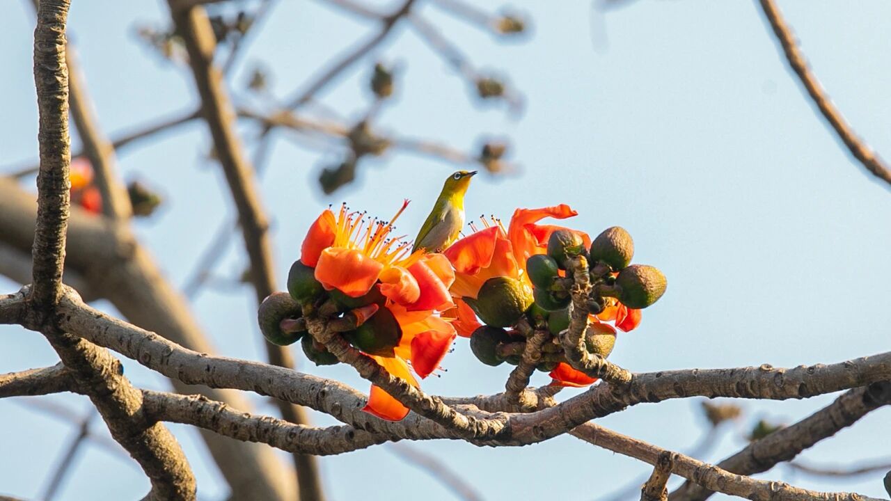 一月的攀枝花学院图书馆旁,一株“不守时”的攀枝花树(木棉树)已悄然点燃了数十支“火把红”。在充足的冬日暖阳下,它比同伴们早醒了近一个月,成为校园里一道意外的风景线。