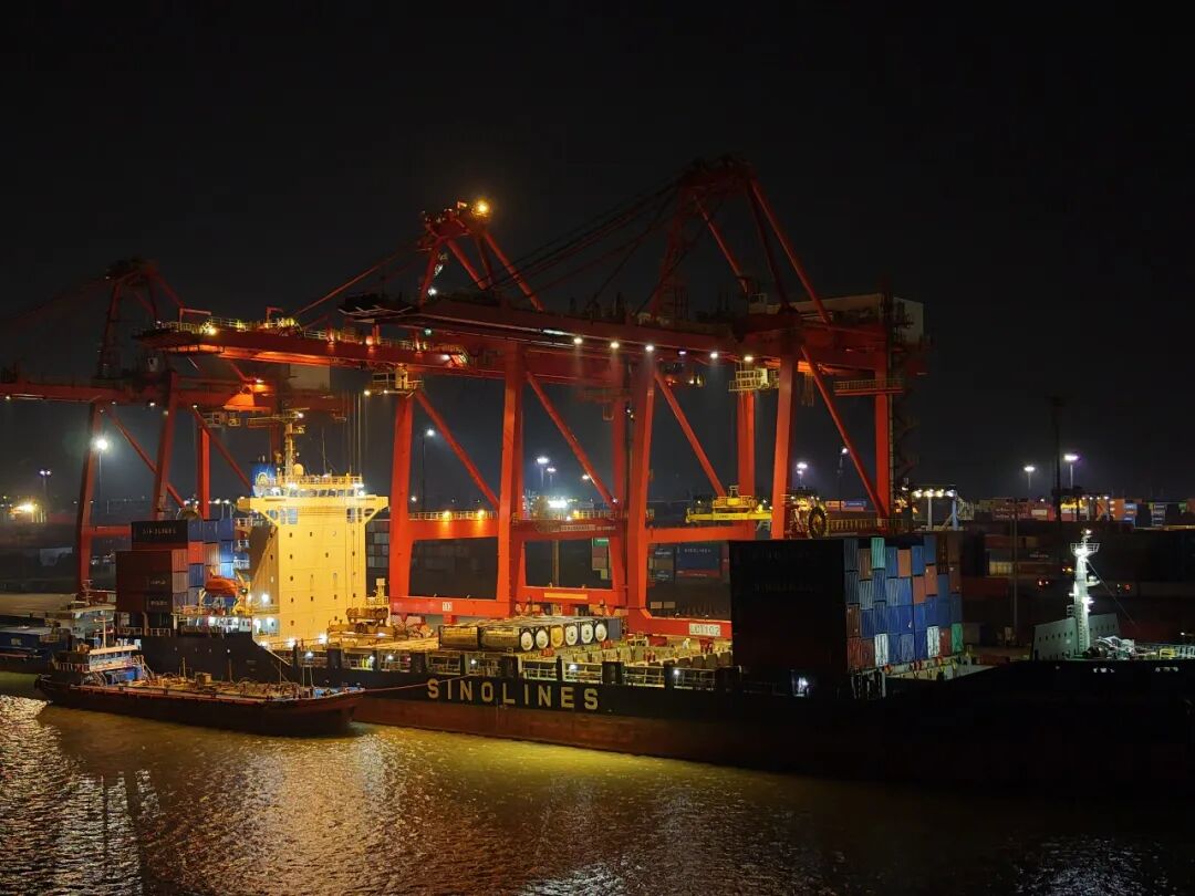 日色渐沉,尧化门货场重归宁静,南京城的另一处物流动脉——南京港龙潭集装箱码头灯火通明,一派繁忙。1月14日晚,记者来到长江边的龙潭港区。只见2310米的码头岸线上,10个泊位依次排开,16台岸桥“巨臂”挥舞,将集装箱从靠泊的巨轮上轻盈抓起,又稳稳放置在等候的卡车上。堆场内,轨道吊、轮胎吊等52台大型设备与往来穿梭的集卡协同作业。龙潭港正以昼夜不停运转,保障着长江黄金水道物流链的高效顺畅。