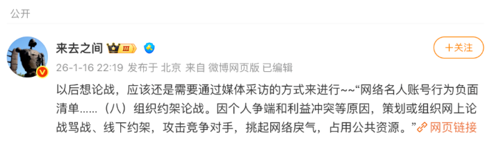 1月16日晚间,新浪微博CEO王高飞通过个人微博@来去之间发布最新消息:以后想论战,应该还是需要通过媒体采访的方式来进行。