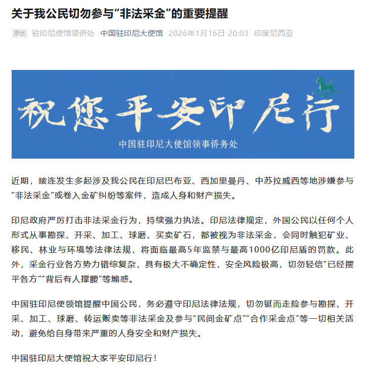 1月16日,“中国驻印尼大使馆”官微发布《关于我公民切勿参与“非法采金”的重要提醒》。