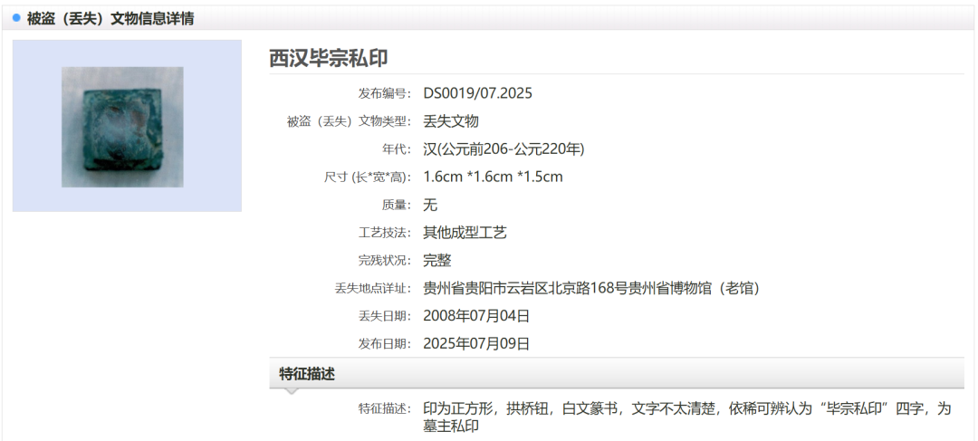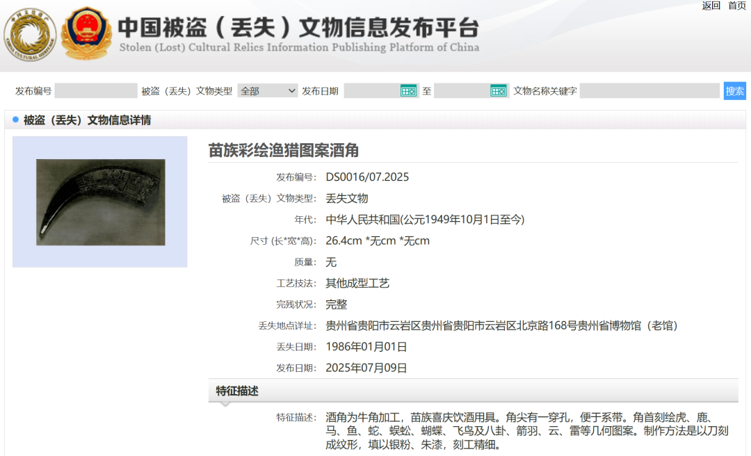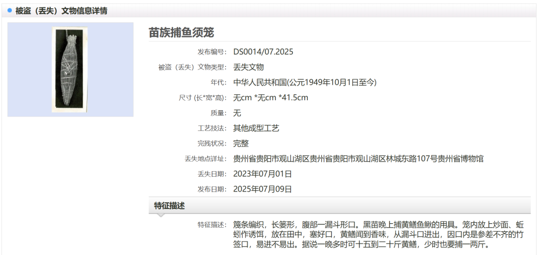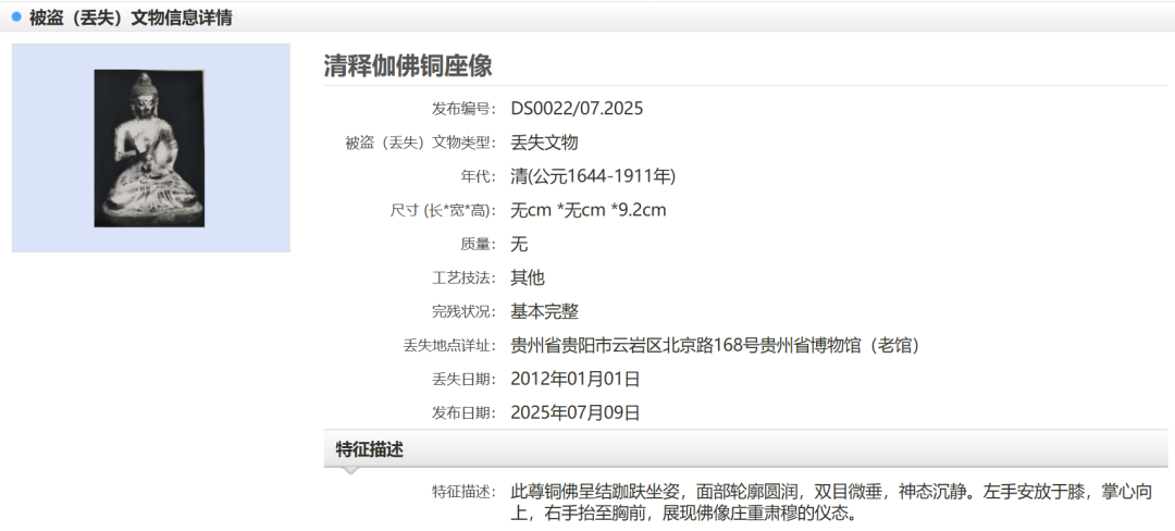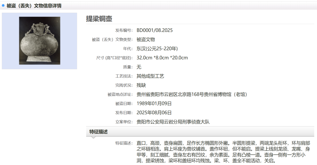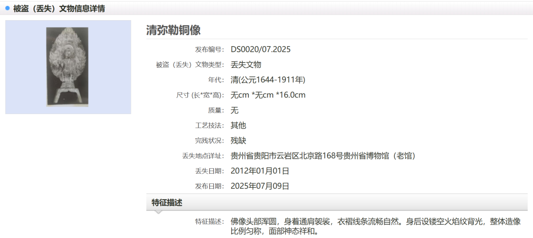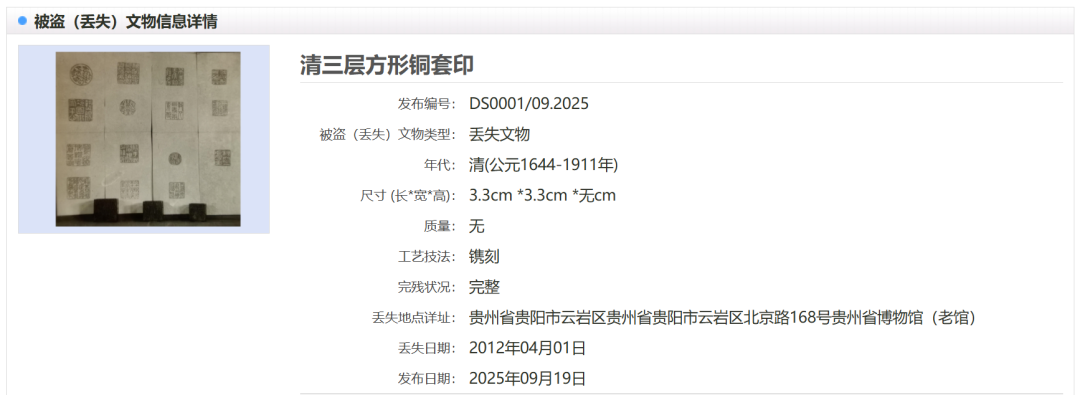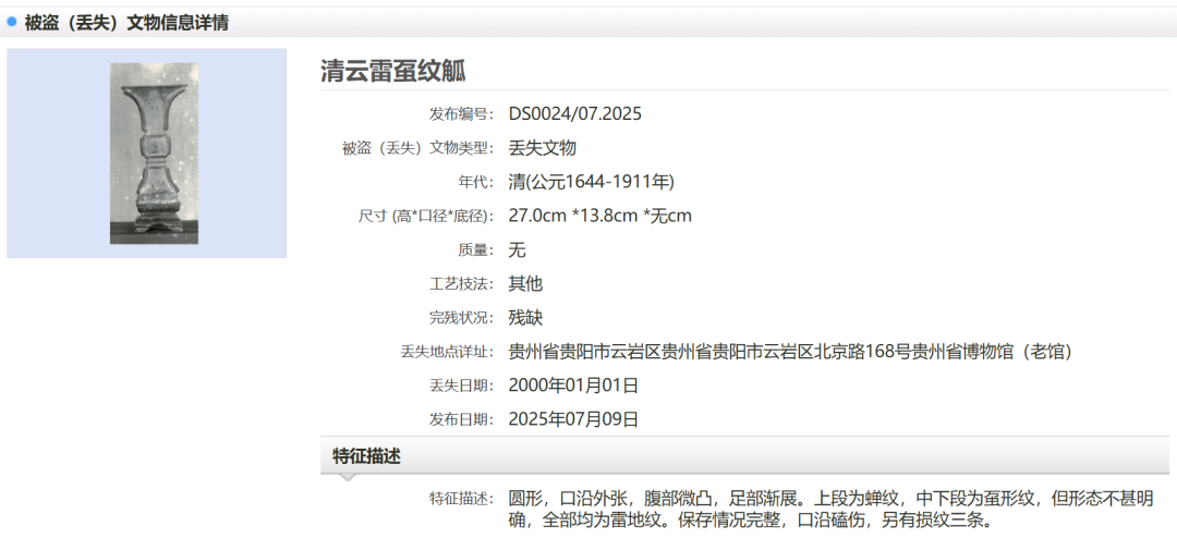 据了解,媒体报道的29件套文物,为1986年至2008年期间多年累计丢失或被盗。贵州省博物馆在“中国被盗(丢失)文物信息发布平台”上发布追索信息,便于公安部门、文物部门发现线索后及时追回。