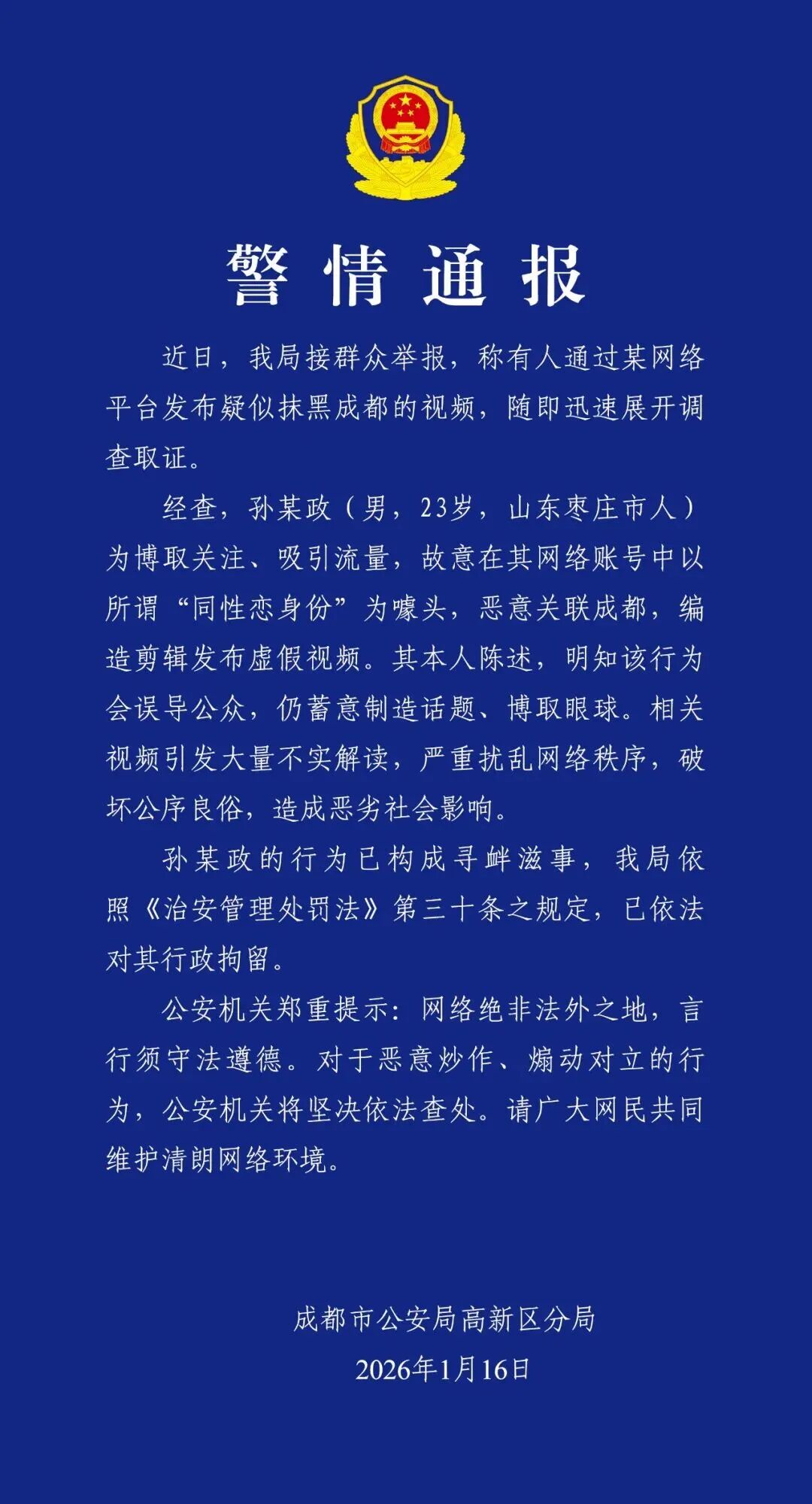 1月16日,成都市公安局高新区分局发布警情通报: