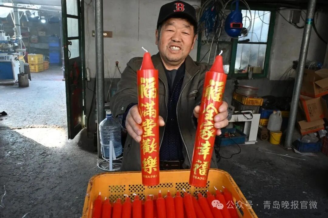 1月13日,在即墨区段泊岚镇西大于庄村制蜡手艺人王际昌的农家小院作坊,十几个工人正在有条不紊地工作着,工作台上摆放着各种大红蜡烛,上面印着“家业兴隆,富贵满堂”“财源茂盛,人寿年丰”等烫金字,洋溢着越来越浓的年味儿。
