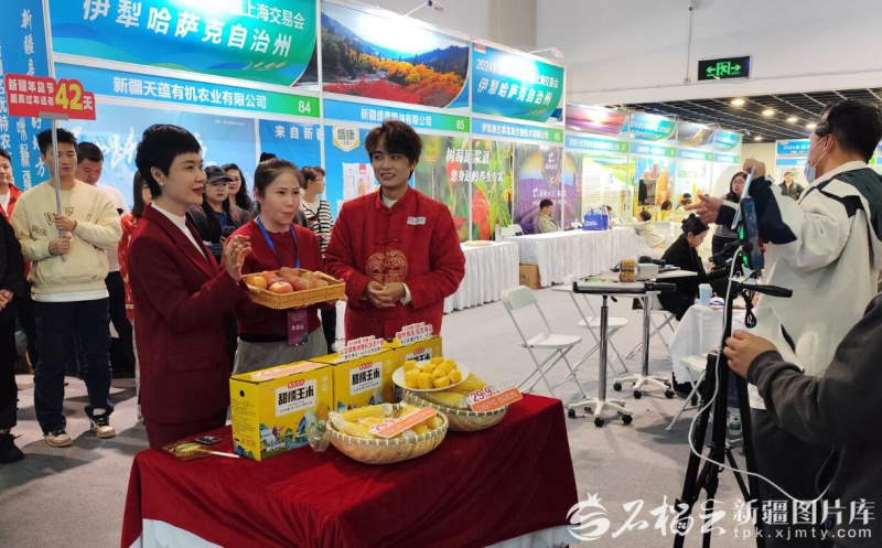 2024年12月15日晚间,贺娇龙团队在2024新疆名优特农产品上海交易会展馆进行直播推介。石榴云/新疆日报记者 刘毅摄