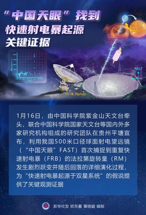 新华社贵阳1月16日电(记者欧东衢、吴思)研究团队近日利用“中国天眼”取得重要突破,揭开“快速射电暴起源于双星系统”的科学“谜题”,为人类理解宇宙极端爆发现象提供了关键证据。