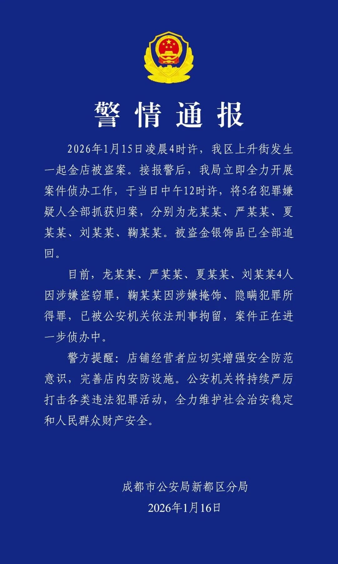 1月16日上午,记者联系到发布视频的金店账号,一名高姓负责人告诉记者,事发1月15日凌晨4时左右,店员早上发现被盗后第一时间报警,成都市公安局新都区分局桂湖派出所迅速展开调查,案件于15日中午告破,“一共是五个人,四男一女,都是十七八岁。”高女士说,经过清点,店内一共被盗饰品40余件,价值10余万元,被盗金饰已全部追回,警方正在进一步调查。