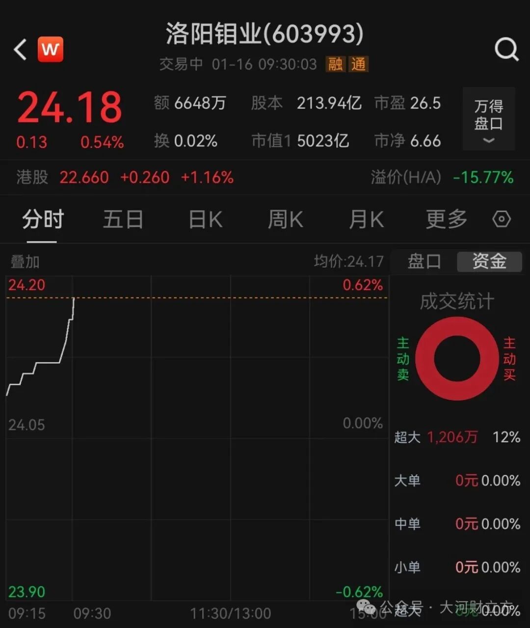 在有色金属价格持续走强、业绩预喜的背景下,1月16日,洛阳钼业股价开盘即拉升,总市值突破5000亿元大关。