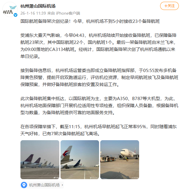 杭州萧山国际机场发布消息:受浦东大雾天气影响,今早04:43,杭州机场陆续开始接收备降航班,已保障备降航班23架次,其中国际航班22个,国内航班1个。在各项保障举措下,截至11:15,杭州机场早航班起飞正常率95%,同时随着浦东天气好转,已有7架次备降航班起飞离场。