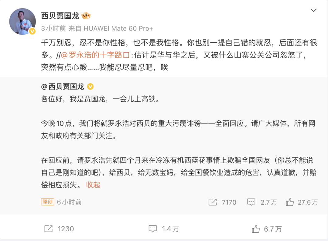 西贝贾国龙与罗永浩线上之争持续受到关注。1月16日晚间,贾国龙启用久未更新的个人微博号宣布,在今晚10点将就罗永浩对西贝的重大污蔑诽谤一一全面回应。