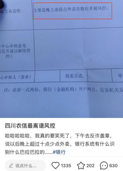 近日,四川一网民反映,因夜间凌晨点外卖次数较多,名下银行卡被银行风控限制交易,且需前往反诈中心签字盖章方可解封。该网友晒出的银行回执截图显示,“晚上凌晨点外卖次数较多”被列为可疑交易说明。