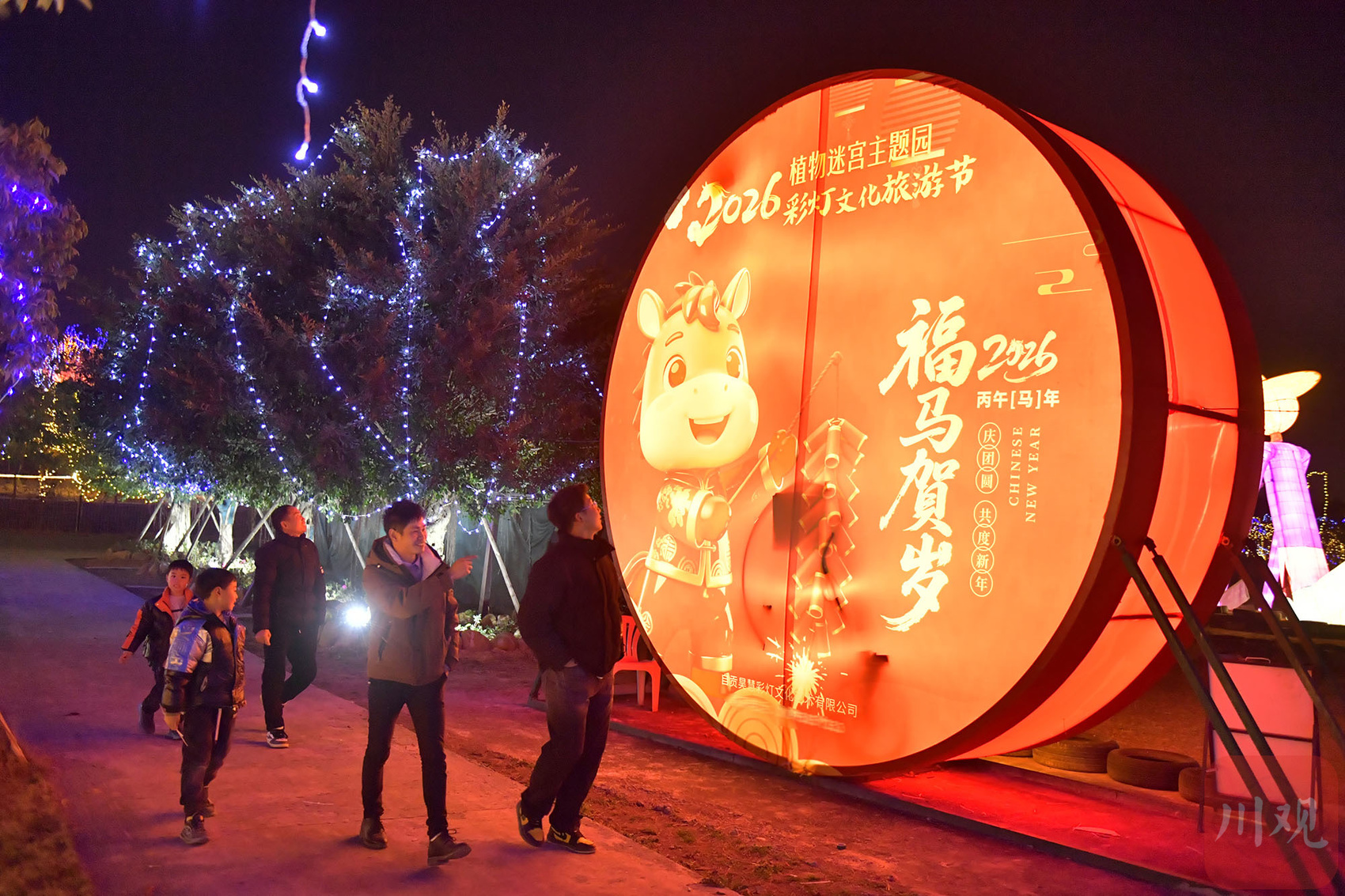 2026年1月16日晚,成都市双流区梦幻植物迷宫彩灯节正式亮灯,吸引游客前来观赏。