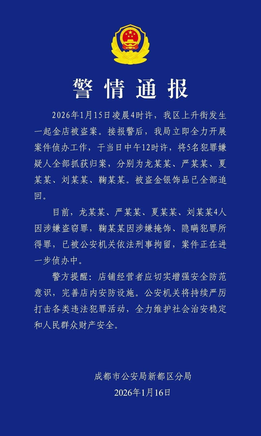 1月17日,记者从成都市公安局新都区分局获悉,1月15日凌晨4时许,新都区上升街发生一起金店被盗案。接报警后,新都区分局立即全力开展案件侦办工作,于当日中午12时许,将5名犯罪嫌疑人全部抓获归案,分别为龙某某、严某某、夏某某、刘某某、鞠某某。被盗金银饰品已全部追回。