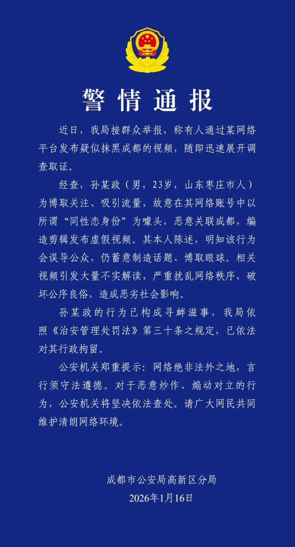 1月16日,成都市公安局高新区分局发布警情通报:孙某政(男,23岁,山东枣庄人)为博取关注、吸引流量,故意在其网络账号中以所谓“同性恋身份”为噱头,恶意关联成都,编造剪辑发布虚假视频,已依法对其行政拘留。