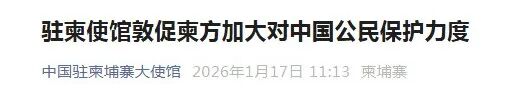 1月17日,中国驻柬埔寨大使馆发文《驻柬使馆敦促柬方加大对中国公民保护力度》。