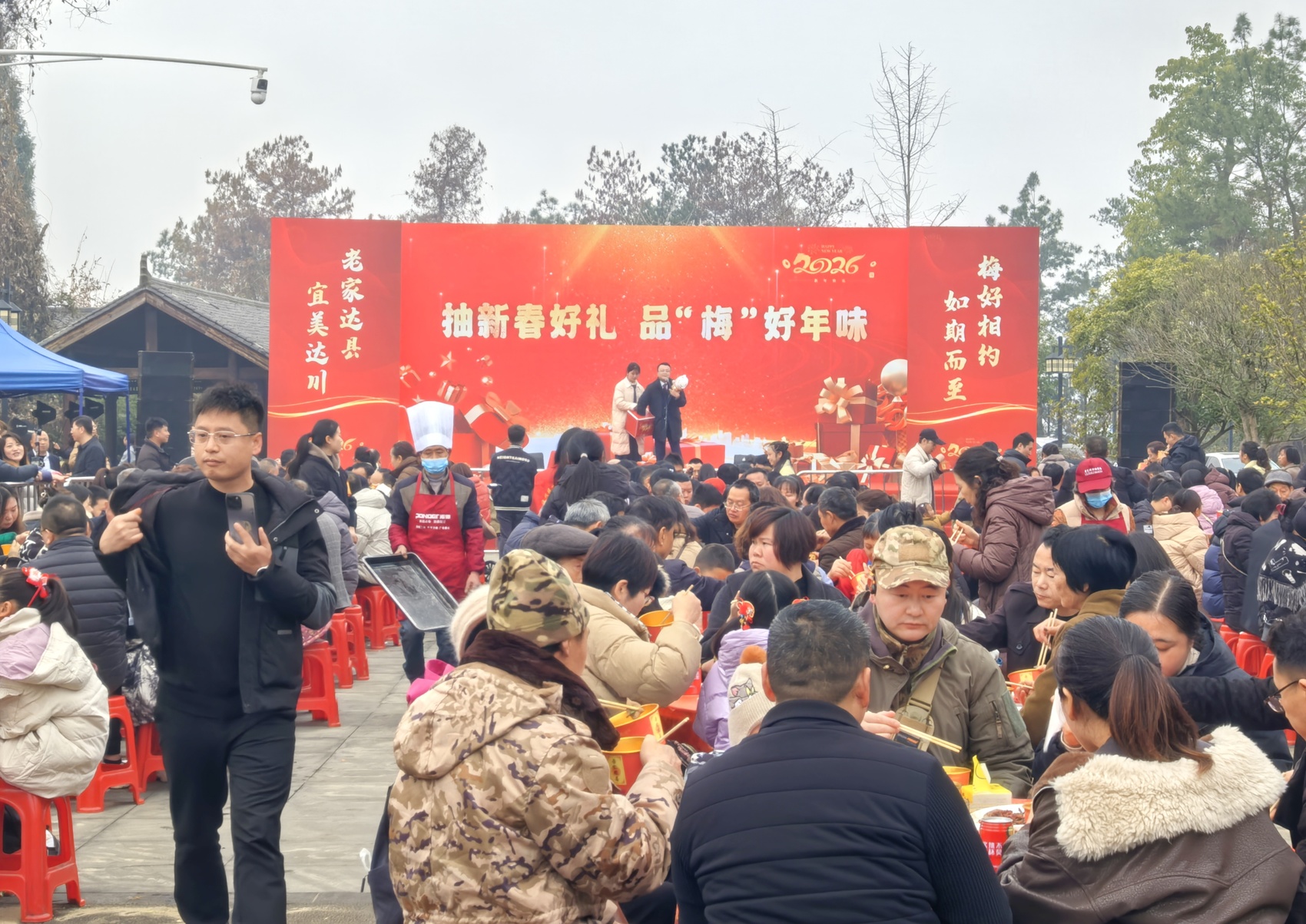雪白的乌梅花漫山遍野绽放、炒菜的煤气灶轰轰作响。1月17日,尽管是周六,但不少游客上午九点半已经赶到了达州市达川区乌梅山上,他们为“庆新年迎新春欢乐贺岁”购(GO)暨“看村晚·吃刨汤”活动而来。