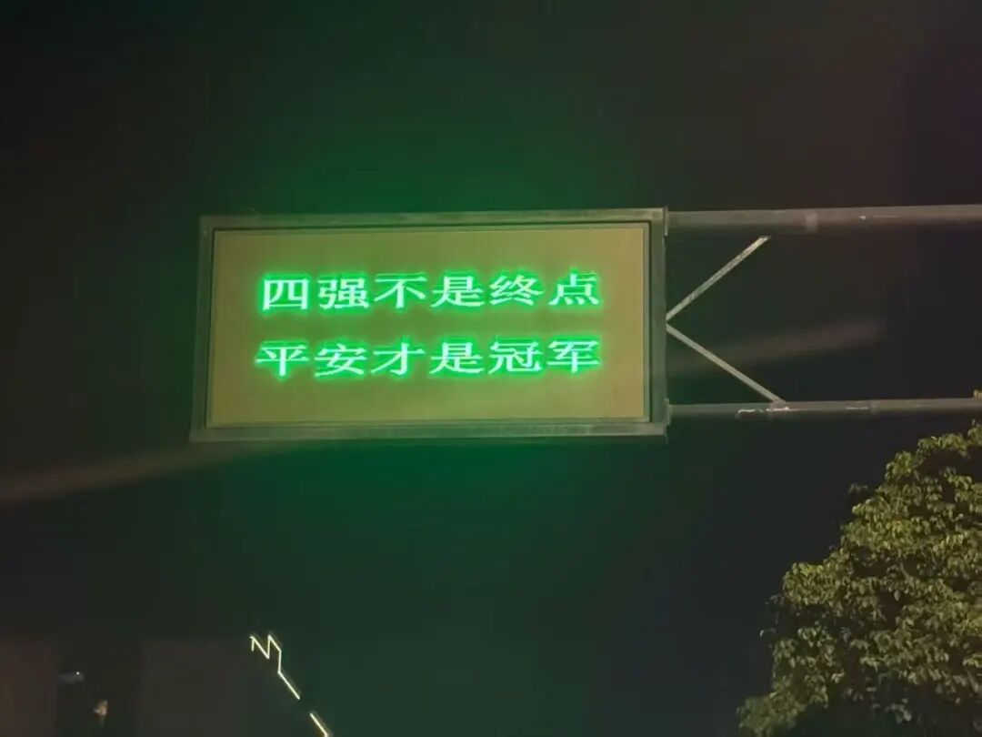 当晚,曾在富阳勇夺杭州赛区冠军时火出圈的道路交通电子屏又整活了——富阳交警大队连夜“上新”多条“四强限定”的交通安全标语,覆盖全区各个交通点位。
