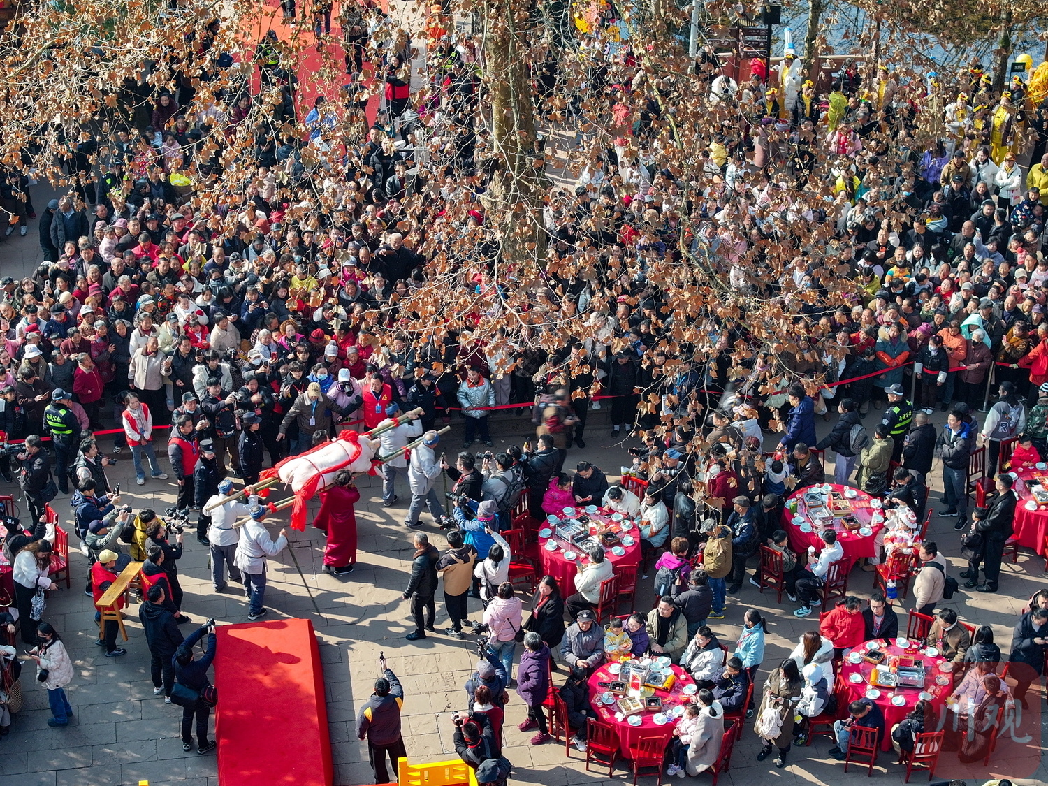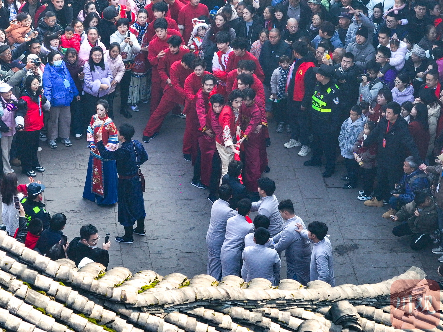 古镇街巷,化身迎亲长廊。从韩家大院到古戏台,一场沉浸式剧目《年猪盛宴·四喜迎春》正在上演。新郎官披红挂彩,引领着花轿、嫁妆、龙狮队伍浩浩荡荡穿街走巷,重现传统接亲盛况。戏台前,“拦门考婿”妙趣横生。街巷中,“古道抢亲”拔河对决引得游人喝彩连连。这场以“喜婚、喜嫁、喜宴、喜游”为核心的互动演绎,让每位游客都成了剧中人。