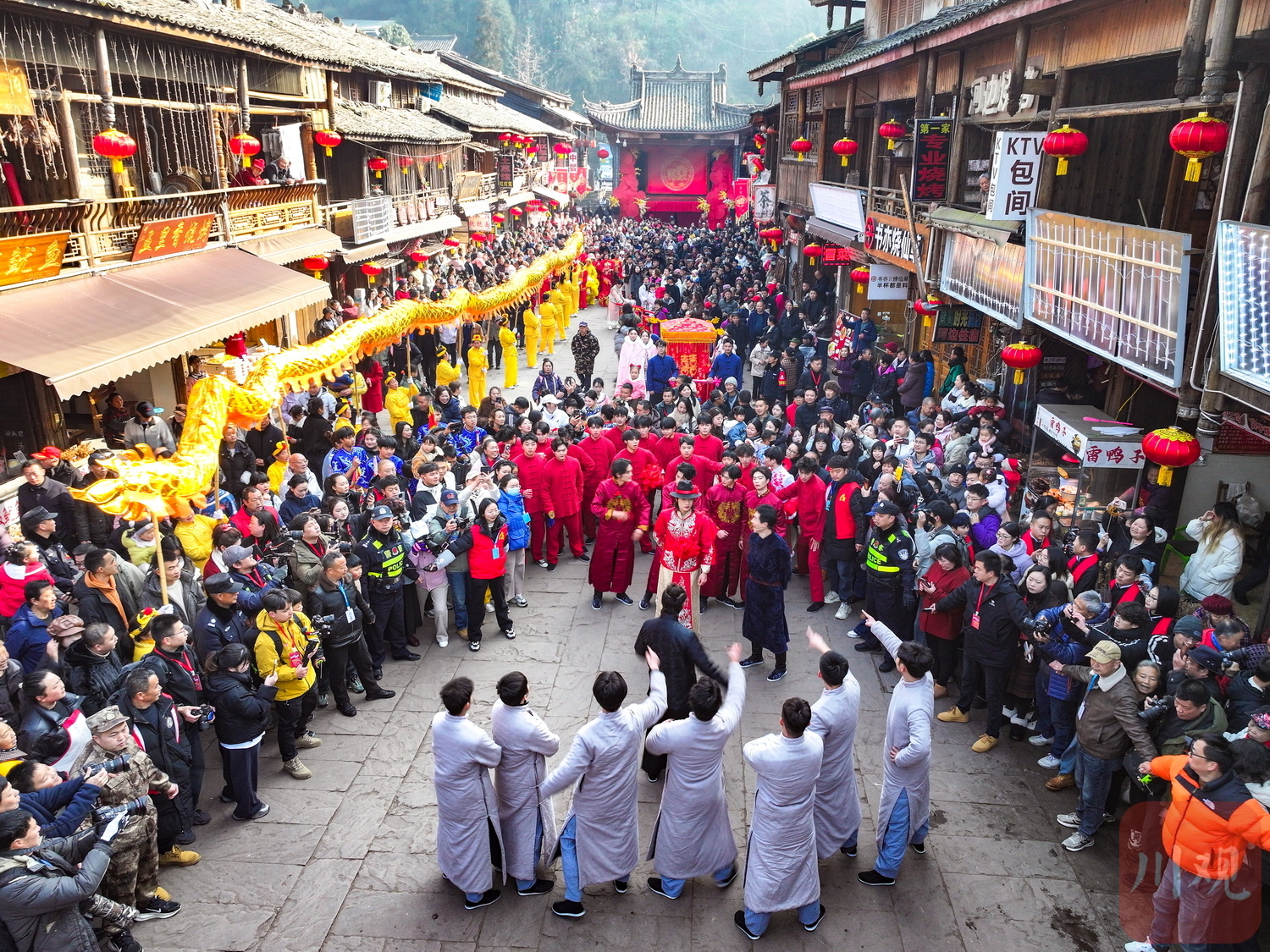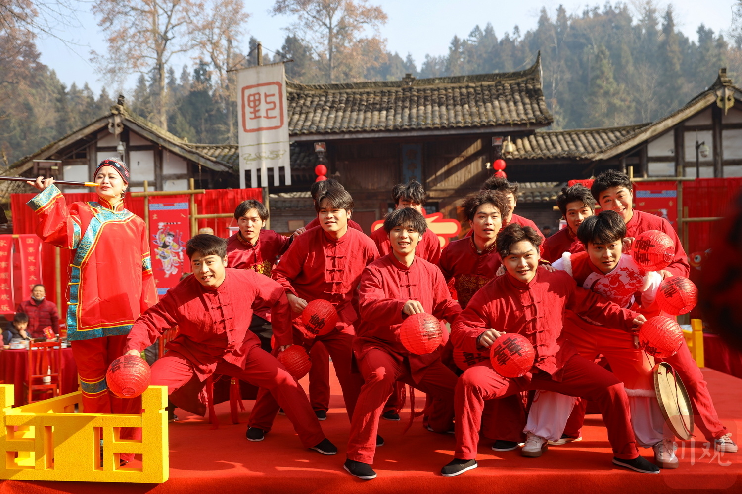 据悉,本次“雨城烟火坝坝年”活动,除主会场核心剧目活动与年猪宴外,一系列丰富多彩的配套活动同步展开,为游客提供沉浸式的多元体验。比如在古镇的二仙桥,设立了“喜结良缘”祈福区,现场还设有春联送福活动。“七雅美食品鉴”区,让游客现场品尝地道风味。与此同时,茶马街上汇聚了本地文创企业与景区商家的旅游集市,雨城特产、文创产品与特色旅游线路在此集中展示与销售。