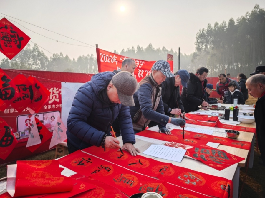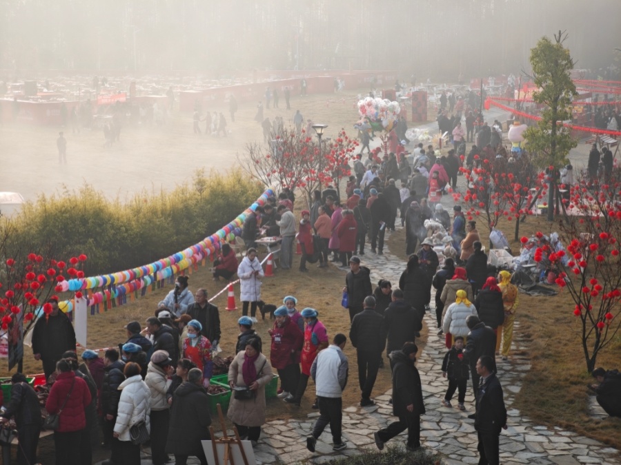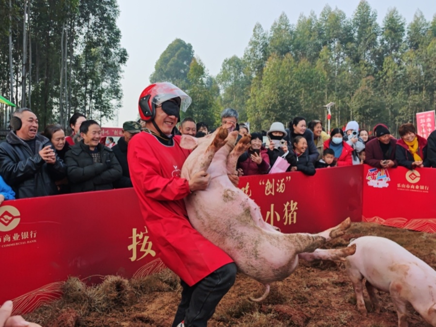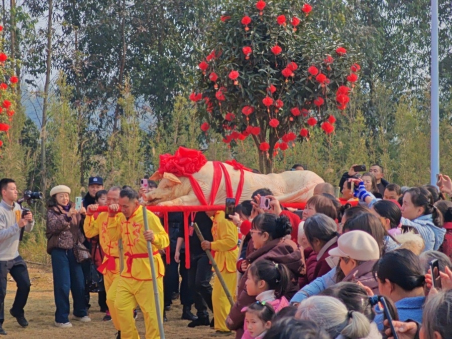 “刨汤”,是川渝地区延续至今的冬日暖俗。活动现场,这一传统被赋予了更鲜活的节庆形式。除了热闹的刨汤宴,还穿插着年猪祭祀、民俗表演、农特产品展销。游客既能观看传统杀年猪流程,也能参与抓猪比赛、抓大鹅、猜灯谜等游戏。集市上,土猪肉、腊肉、香肠、柑橘等当地农产品琳琅满目,不少游客手提肩扛,将剑峰年味带回家。