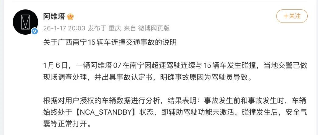 1月17日,@阿维塔 发布关于广西南宁15辆车连撞交通事故的说明: