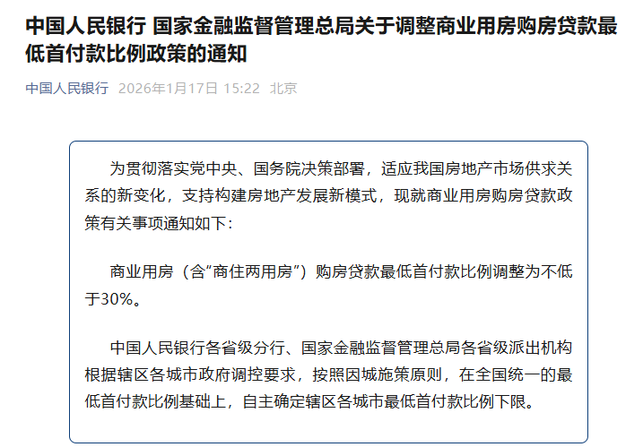 新华社消息,为贯彻落实党中央、国务院决策部署,适应我国房地产市场供求关系的新变化,支持构建房地产发展新模式,现就商业用房购房贷款政策有关事项通知如下: