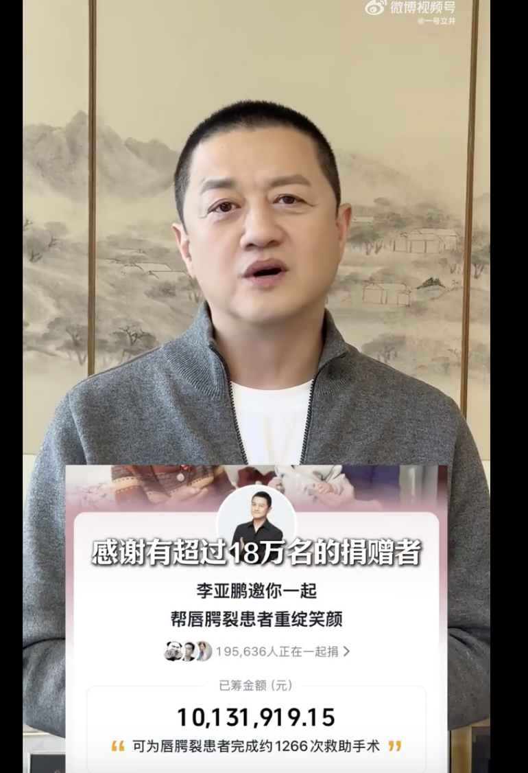 在此前的采访视频中,李亚鹏介绍,嫣然天使儿童医院在10年间累计完成11000台唇腭裂手术,其中7000名患儿全额免费。