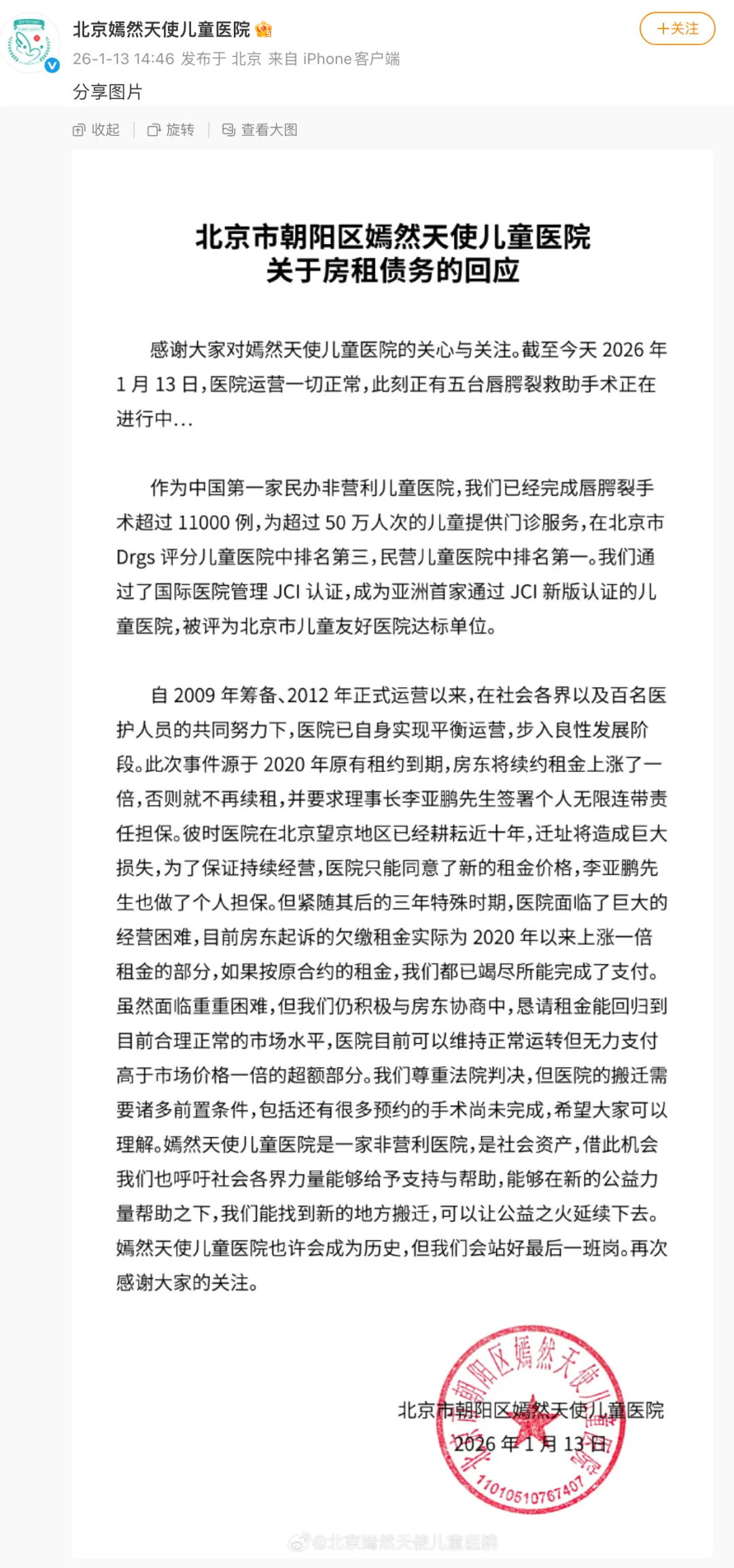 南都此前报道,1月13日下午,@北京嫣然天使儿童医院 发布“北京市朝阳区嫣然天使儿童医院关于房租债务的回应”。
