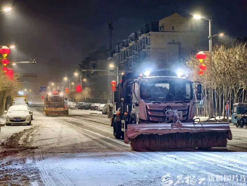 1月17日清晨7时35分,清雪车辆在乌鲁木齐市碱泉街集中清雪作业。石榴云/新疆日报记者 李雄心摄