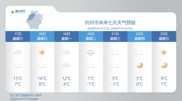 19 日下午起,寒潮开始影响杭州,届时将有一次强降温、雨雪和大风天气过程。预计当日最高12℃,20日仅1℃,一天内最高气温暴跌11℃。