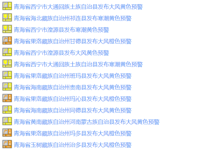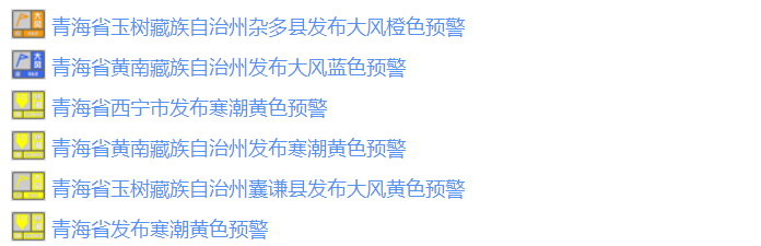 青海省气象台1月17日10时发布寒潮黄色预警:预计1月18日8时至20日8时,西宁、海东、海北北部、黄南北部、格尔木地区将出现寒潮天气,气温将下降10~12℃,局地可达14℃;19日白天,西宁、海东、黄南北部地区气温将降至-4℃以下,20日早间气温将降至-15℃以下。过程期间,湟中、互助、祁连、门源、天峻、都兰等地有分散性小雪,降雪量0.1~1.2毫米。全省大部有6~7级偏西风,阵风可达8级以上,西宁、海东有4~5级偏东风,部分地区伴有沙尘天气。寒潮天气对农牧业生产、能源保供、公众健康有较大影响,请注意防范。(预警信息来源:国家预警信息发布中心)