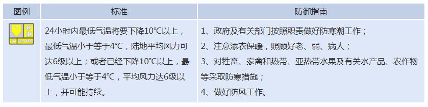 防御指南:1.政府及有关部门按照职责做好防寒潮工作;2.个人注意添衣保暖,对气温变化敏感的人群尽量减少外出;3.农、林、牧、养殖业等采取防护措施。(预警信息来源:国家预警信息发布中心)