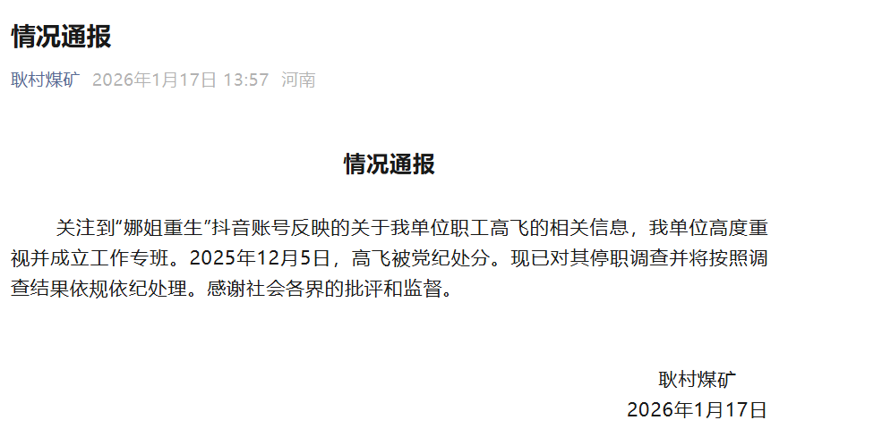 关注到“娜姐重生”抖音账号反映的关于我单位职工高飞的相关信息,我单位高度重视并成立工作专班。2025年12月5日,高飞被党纪处分。现已对其停职调查并将按照调查结果依规依纪处理。感谢社会各界的批评和监督。