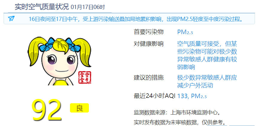 此前在1月16日23时35分,上海中心气象台发布大雾黄色预警信号:预计未来12小时内,本市大部地区将出现能见度小于500米的雾,局部地区能见度小于200米,个别地区能见度小于50米,请注意防范低能见度对道路交通的不利影响。