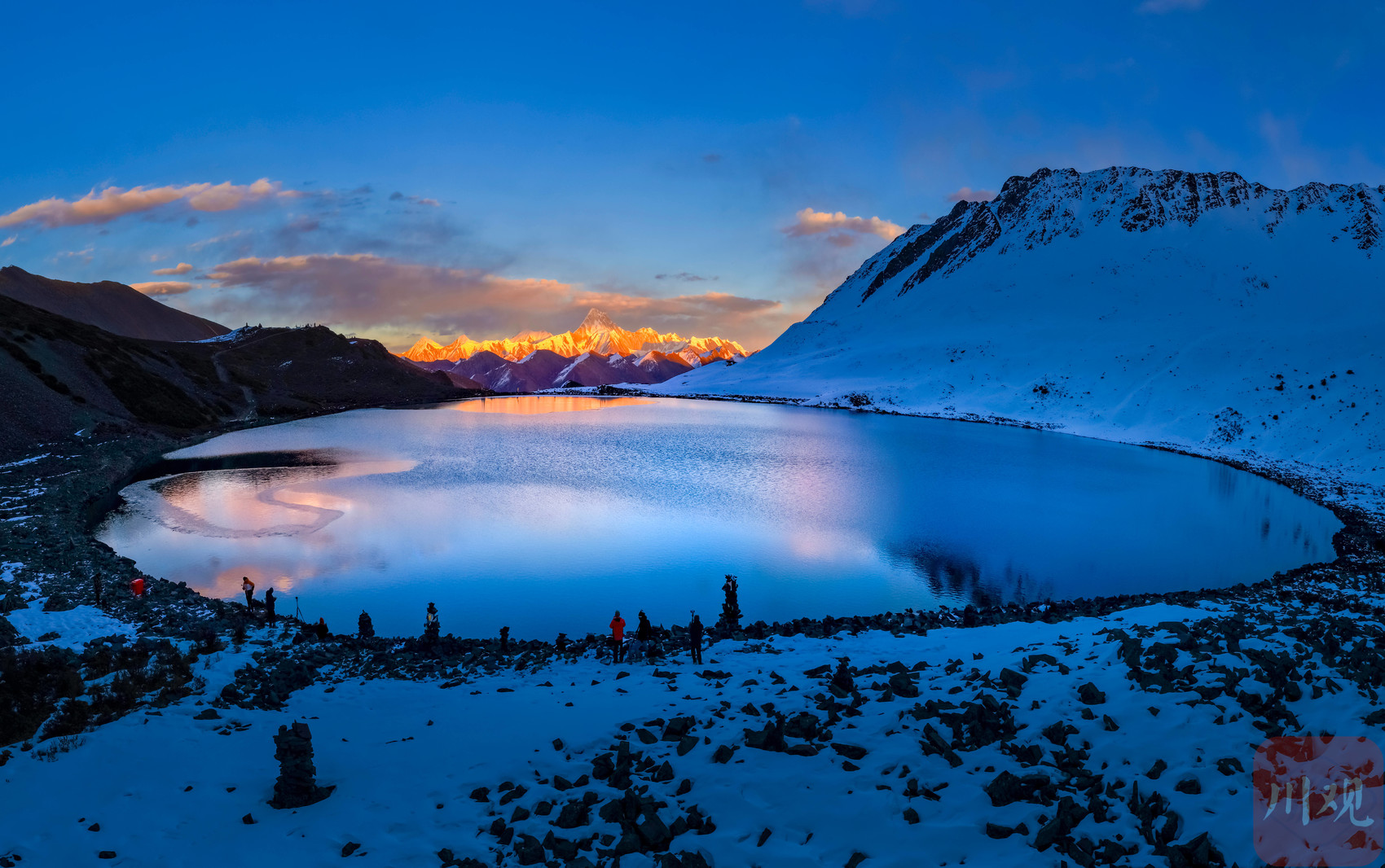 游客在甘孜州康定市沙德镇观德结湖观赏日照金山。(邹丽君 摄)