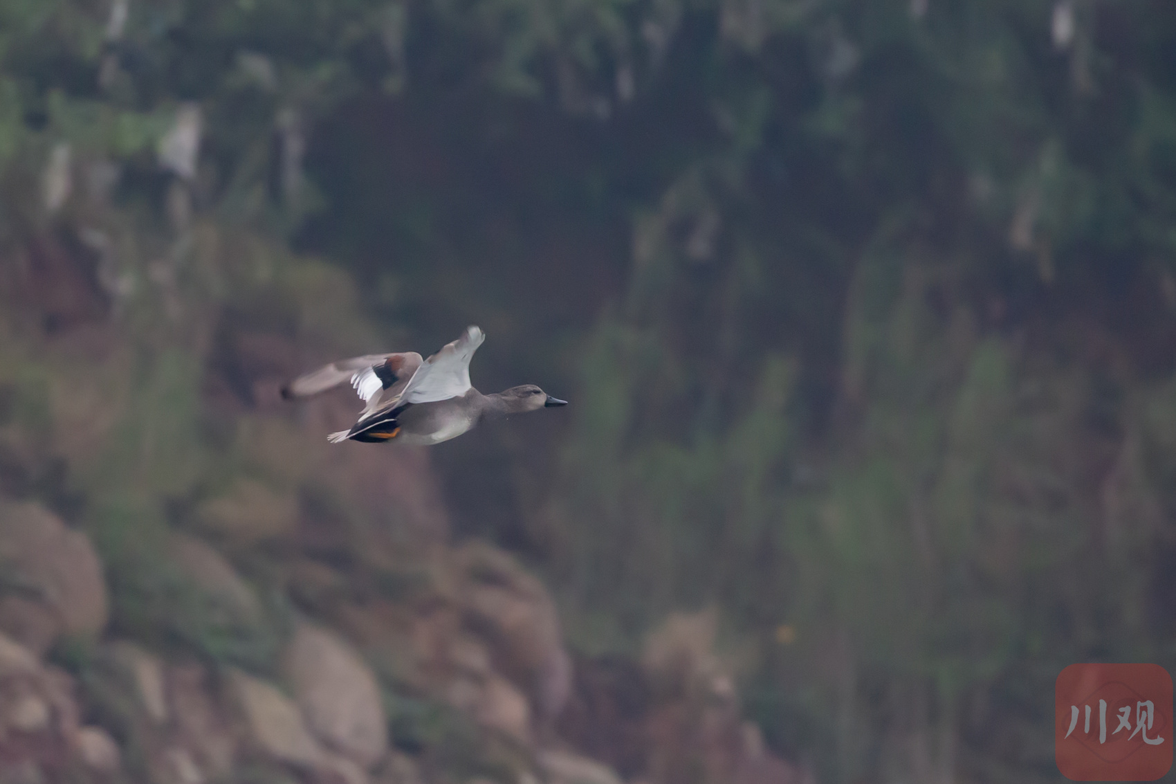 赤膀鸭:雄鸟胁部具细密栗色横斑,飞行时翼上白斑显著。栖于开阔水域,性机警,常混于其它鸭群。