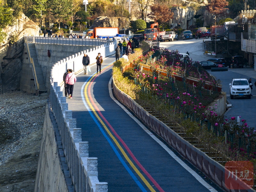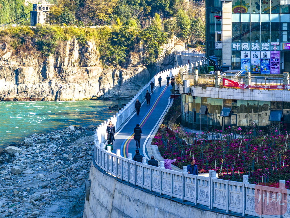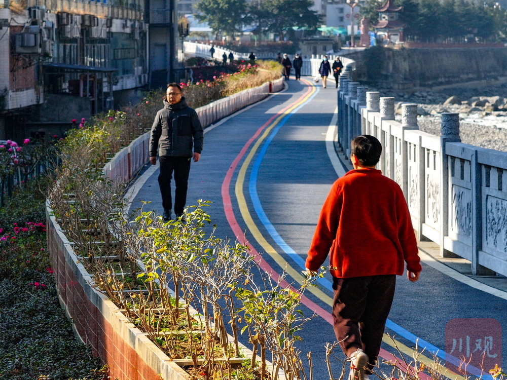 1月18日清晨,大渡河干流的雅安石棉县城区,新建成投用的百度段堤防整治工程沐浴在晨光和绿植区艳丽花海的阵阵幽香中,油亮的堤坝步游道上,晨练散步的市民络绎不绝,成为小城一道靓丽的风景。
