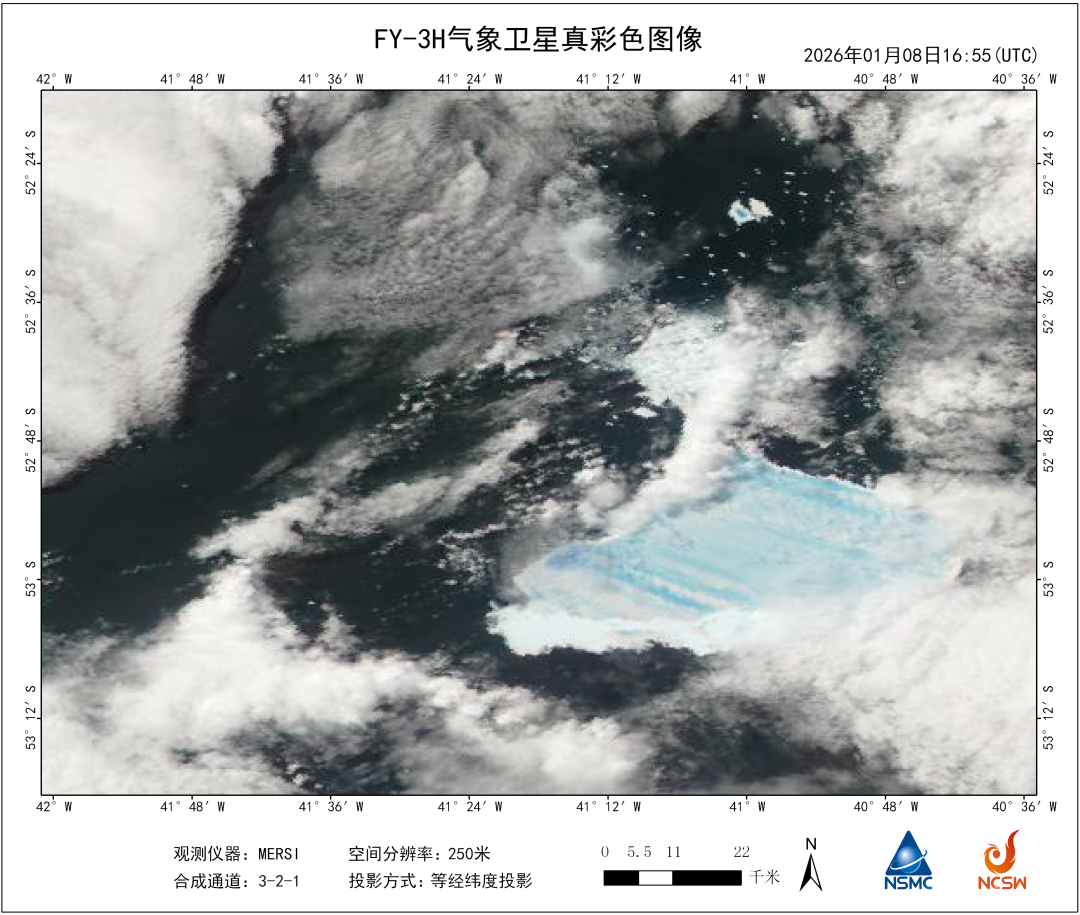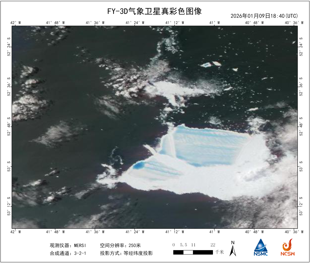 1月14日,风云三号D星传回250米级分辨率的真彩色图像显示,曾经的世界最大冰山A23a主体面积仅余506平方公里,不足其最初规模的八分之一。而就在三周前,该冰山主体尚有948平方公里。