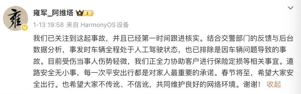 事故发生后,当事用户本人确认,其从未接受过媒体采访。自1月13日该司首次公开说明情况后,仍有部分媒体在未经任何核实的情况下,持续发布“肇事司机称驾驶辅助系统失控”等完全背离事实的报道,进行恶意剪辑与传播,严重侵害该司品牌声誉。