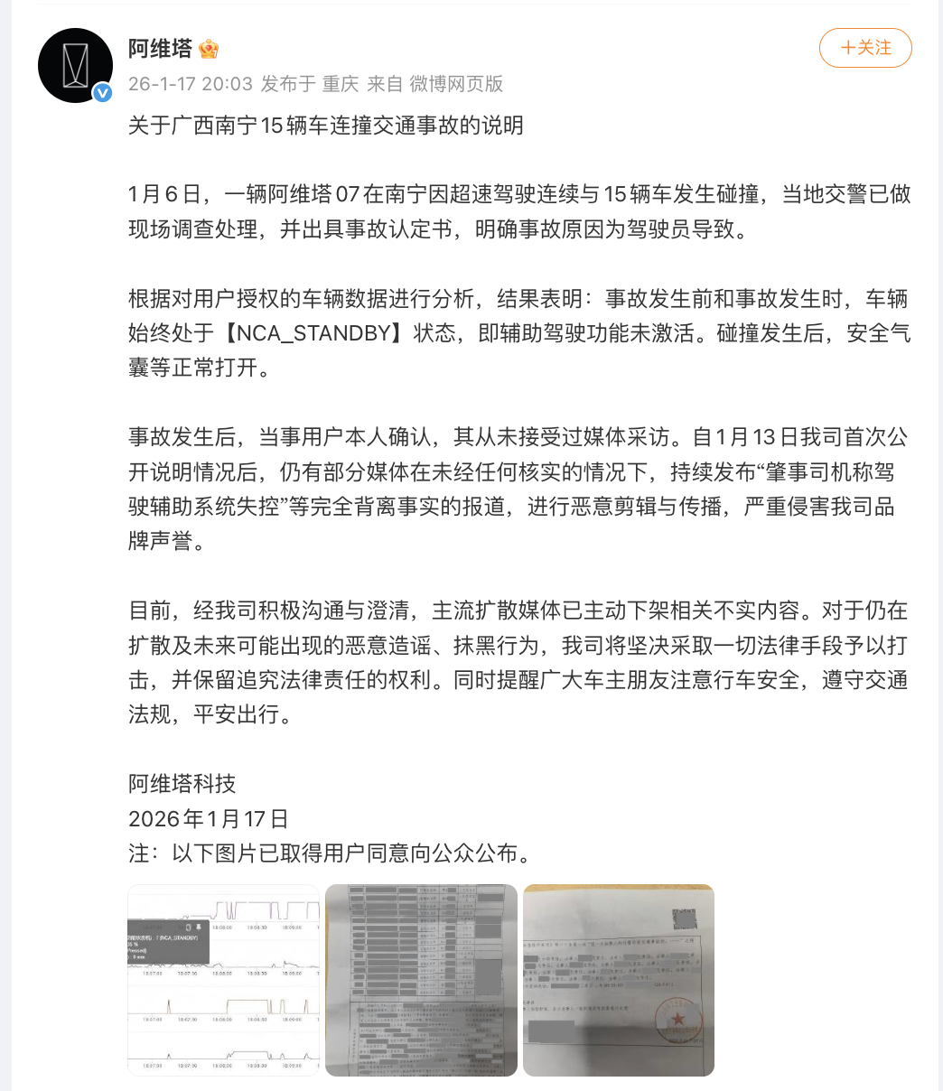 1月17日,@阿维塔 发布关于广西南宁15辆车连撞交通事故的说明: