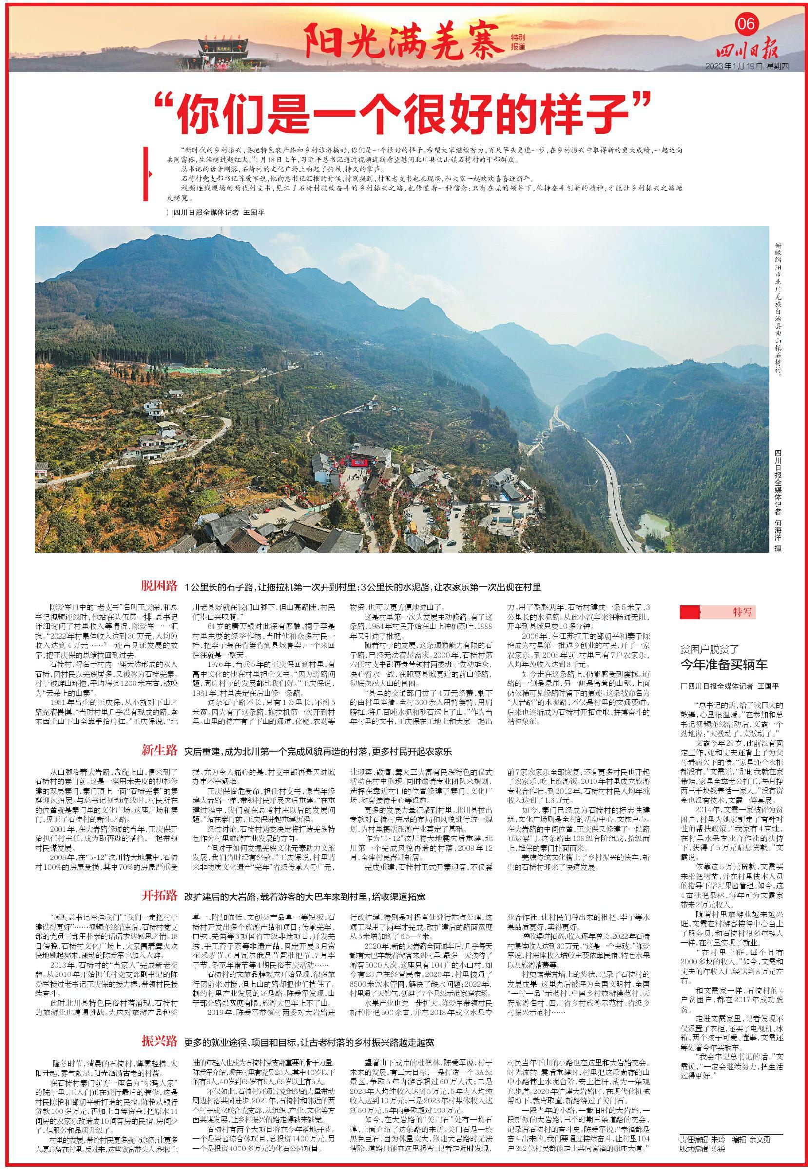 如今回看,我们写的每一篇报道,记录的每一组数据、每一个细节,正串联起这座羌寨的振兴轨迹。 2023年1月18日视频连线后,我们为“阳光满羌寨”为主题,聚焦“嘱托与期许”,彼时的石椅村虽然已是乡村振兴的“好样子”,但基础设施仍有短板——村道坡陡弯急、会车困难,民宿尚未形成规模,农产品销售依赖季节性摆摊。