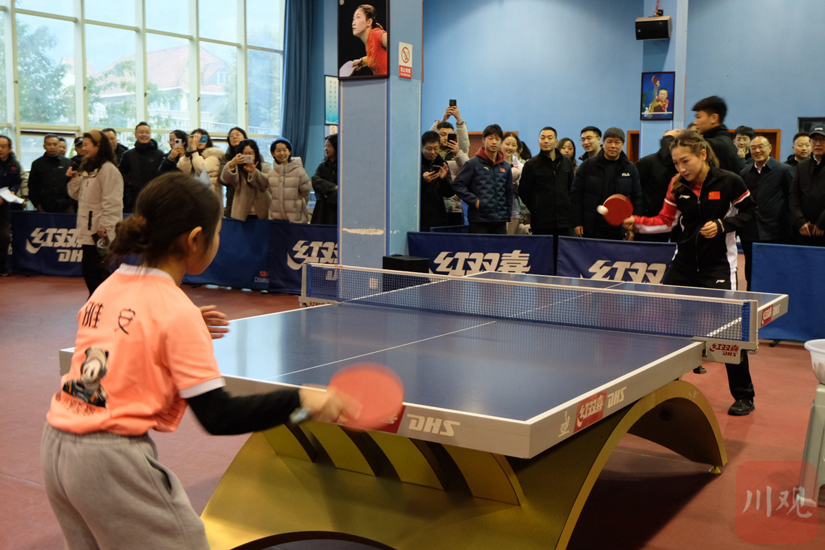 刘诗雯和小球迷、雅安运动爱好者“切磋”乒乓球