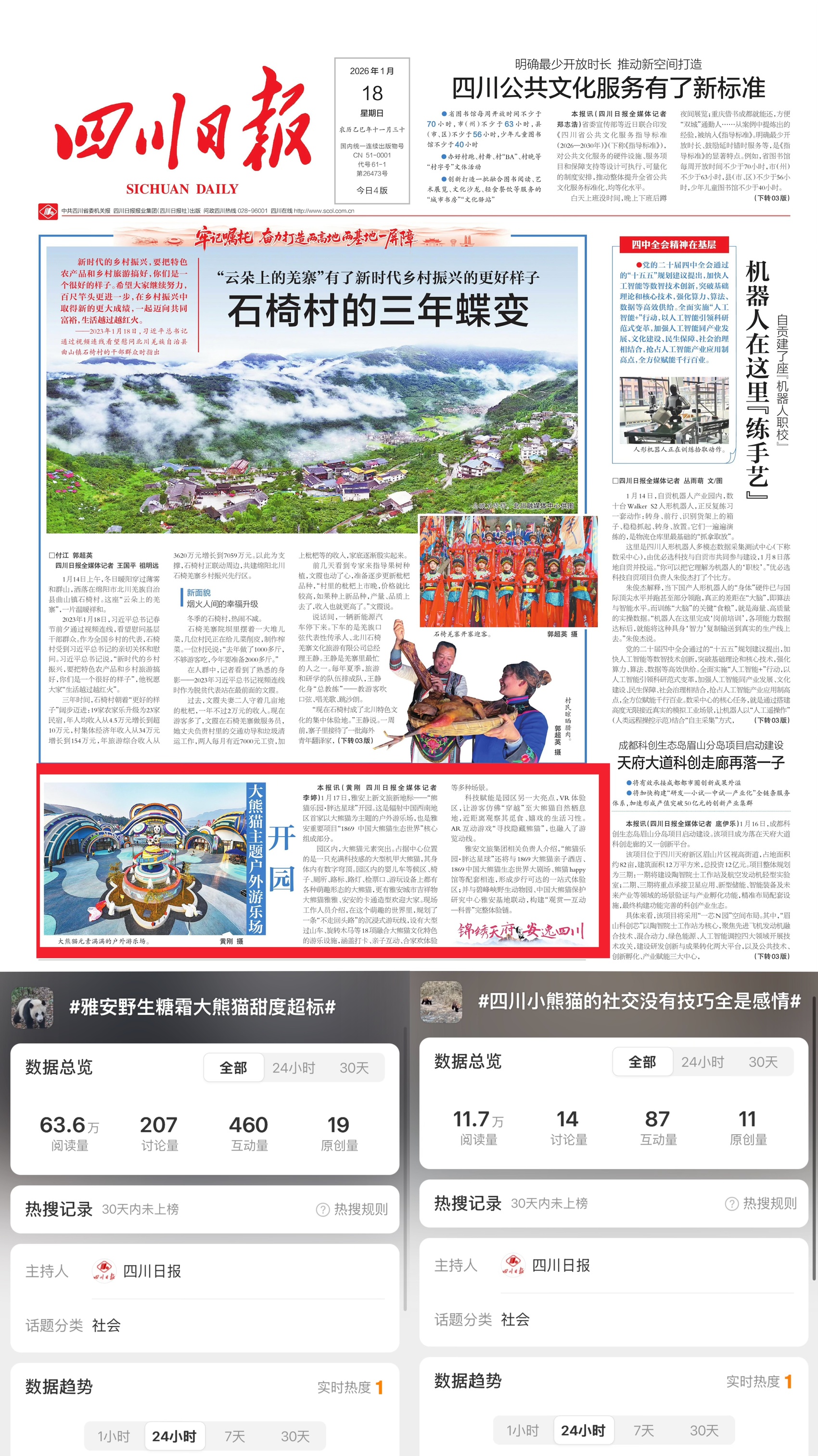 2026年第三周(1月12日至1月18日),“十五五”开局首月里,雅安一系列高密度、高质量的文旅体融合实践,为何获得了《四川日报》头版的关注,还登上了数个同城热搜获得超10万+的流量?