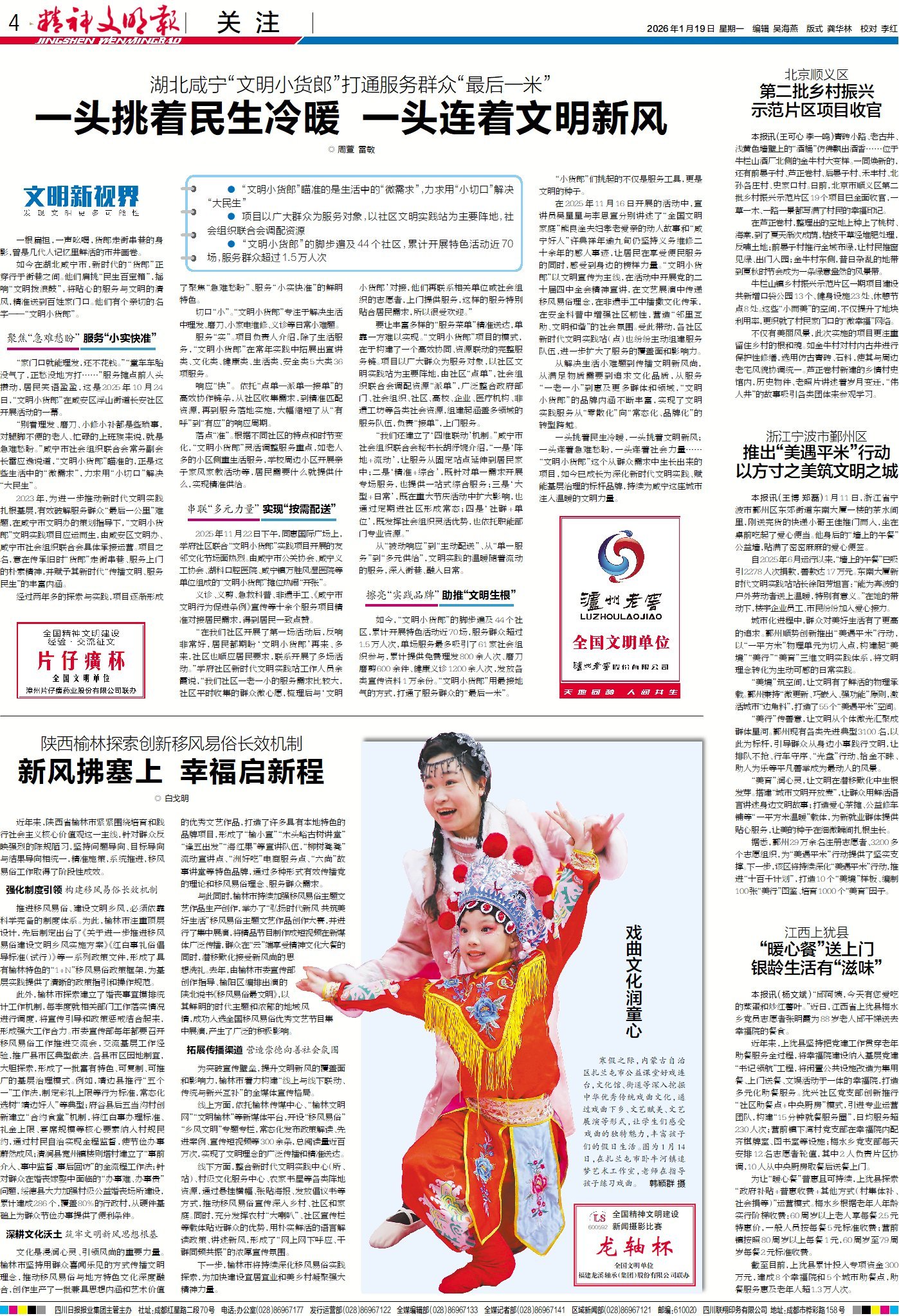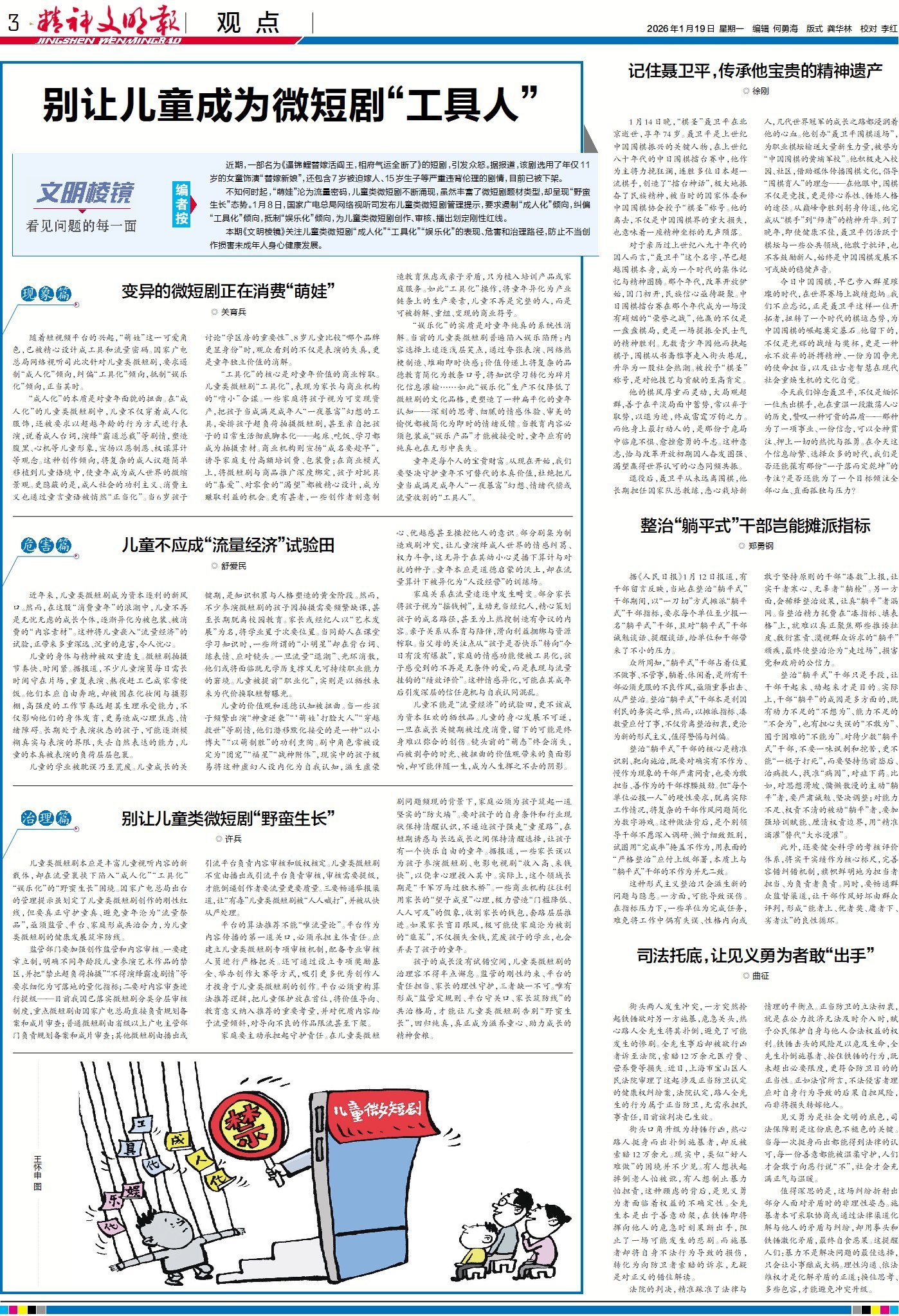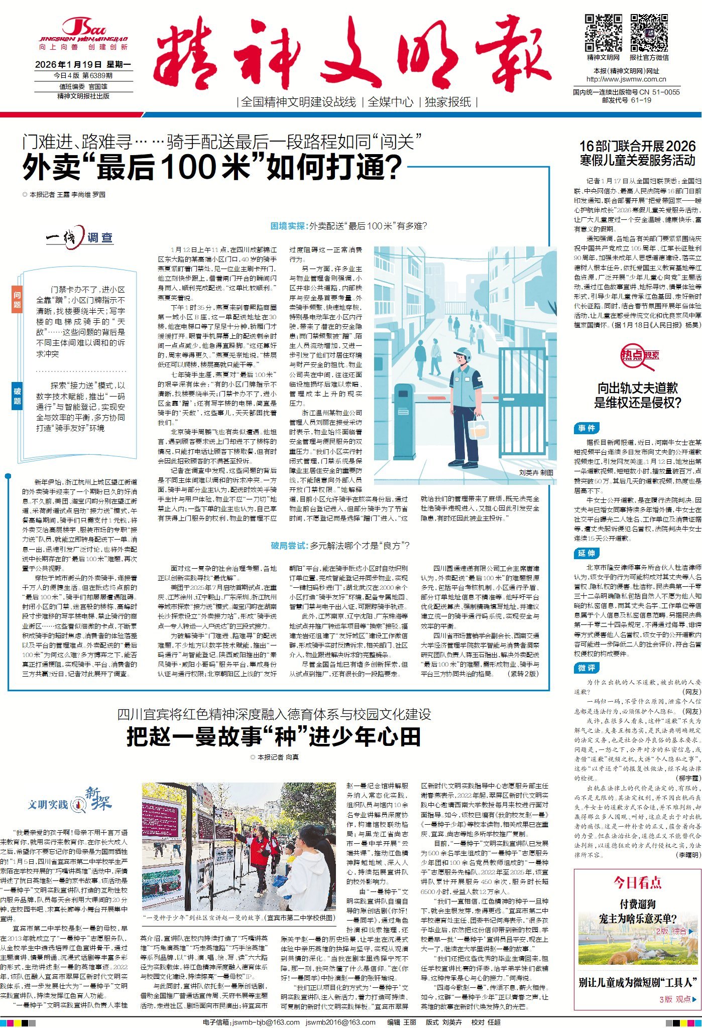 今日版面“早”知道:1版头条《一线调查》栏目聚焦外卖配送的“最后100 米”难题,分析其背后成因,探索多方共赢的解决之道;倒头条《文明实践新探》栏目关注四川宜宾“一曼种子”文明实践宣讲队将红色精神深度融入德育体系与校园文化建设的案例;《热点观察》栏目围绕河南牛女士连续多日发视频向“出轨丈夫”道歉事件,看多方观点;3版《文明棱镜》栏目聚焦儿童类微短剧“成人化”“工具化”“娱乐化”的表现和危害,探讨如何治理;4版《文明新视界》栏目关注湖北咸宁“文明小货郎”打通服务群众“最后一米”的探索与实践。