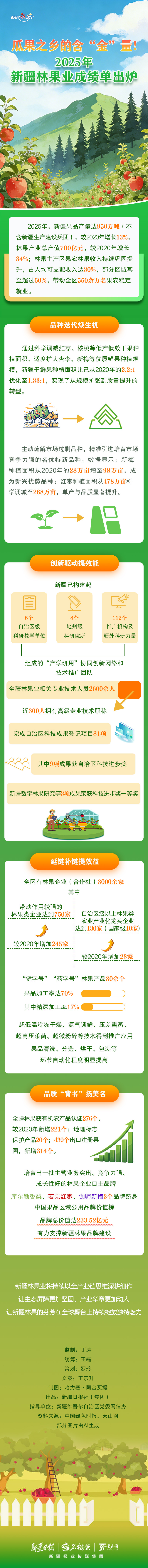 2025年,新疆林果业总产值达700亿元(不含新疆生产建设兵团),果品产量950万吨,带动全区550余万果农稳定就业。亮眼成绩背后,新疆在推动林果业发展方面采取了哪些重要举措?本期《数说“新”变化》与您共同探寻答案。