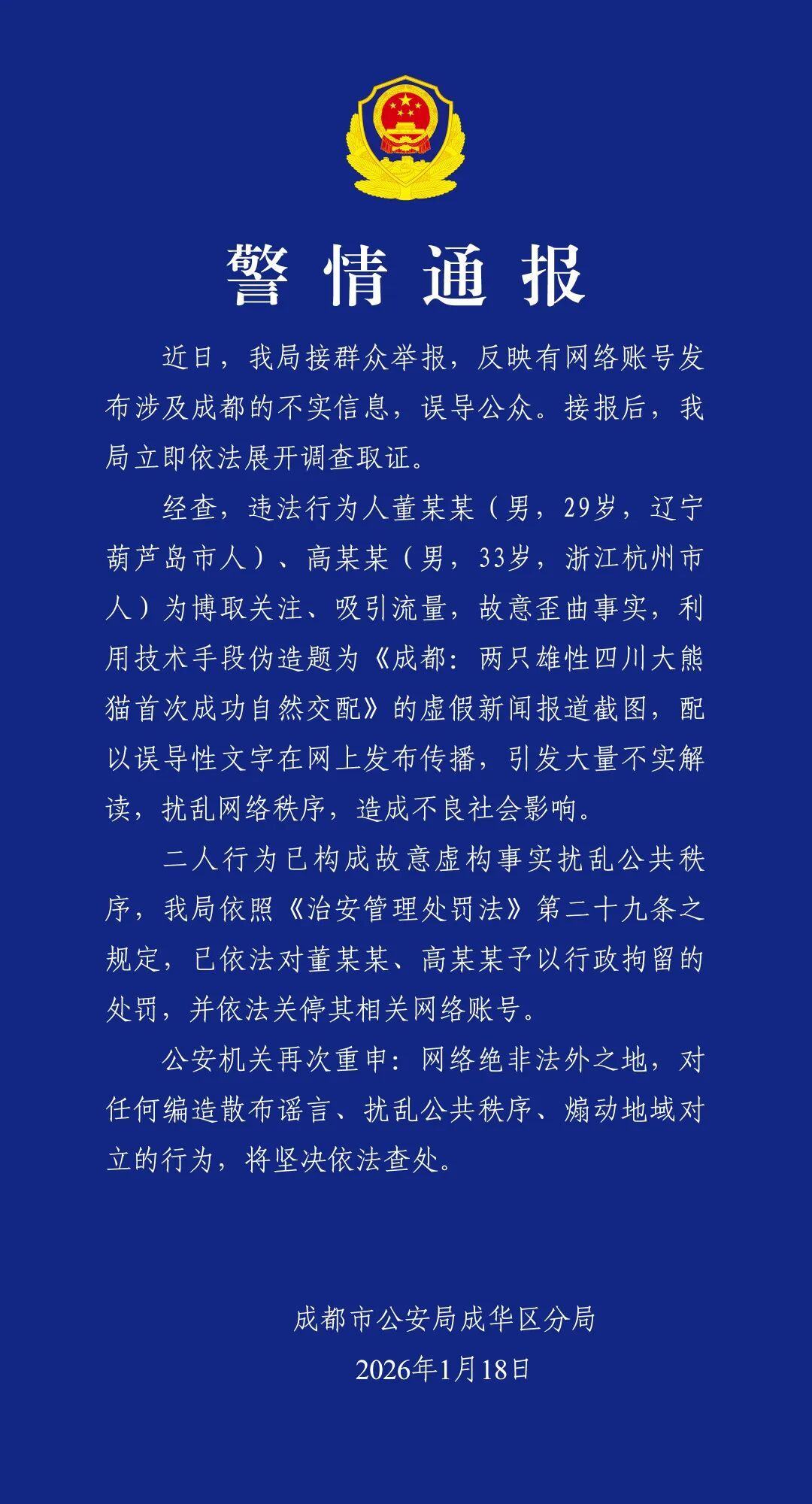1月18日,成都市公安局成华区分局发布警情通报,全文如下: