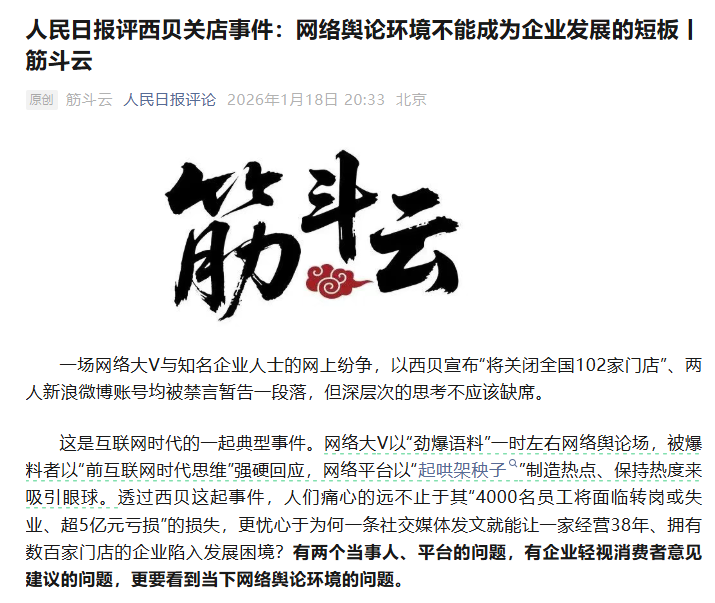 对企业,当然可以批评,但必须客观理性,对别有用心者必须警惕。延伸看,有多少民营企业遭遇了网络“黑嘴”、网络水军的造谣抹黑?有多少大V、小号、“自媒体”裹挟民意、游走在红线的边缘?有多少平台刻意制造热点、借热点挑起群体极端对立情绪?西贝事件早已超出口水战,罗永浩们、贾国龙们、新浪微博等平台们,都有要汲取教训的地方,“营造清朗的网络空间”绝不是一个虚设的命题,而是各方必须时刻答好的共同答卷,谁违背了这一守则,谁终将受到严厉惩罚。