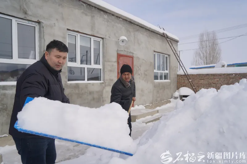 1月16日,富蕴县吐尔洪乡康阔勒特克村志愿服务小分队帮村民打扫院落内的积雪。阿吴英·哈得勒别克摄